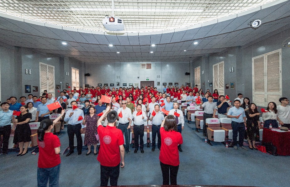 最后,全场齐声高唱《我和我的祖国》,激情昂扬的歌声在红楼学术报告厅内久久回荡,将开学典礼推向高潮。
