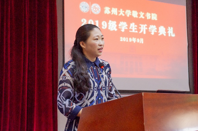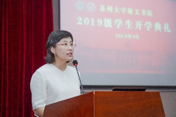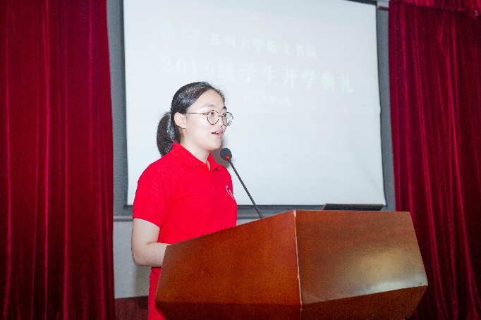 新生代表陆橼羽同学发言表达了她对苏州大学及两院的感谢与热爱。她表示,自己定会努力肩负起传承家国情怀与民族精神的重任,为苏大、为两院增光添彩。