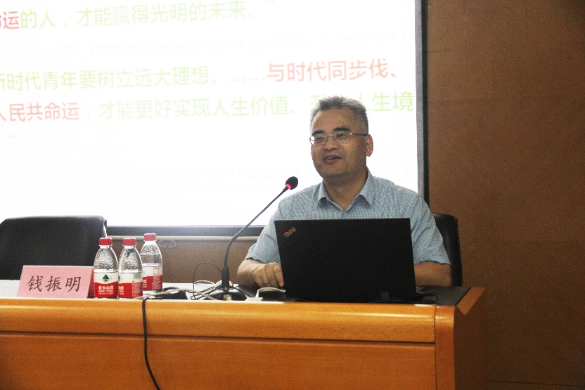 首先,钱振明院长以提问的形式,启发同学们思考自己的过去、现在、未来。他要求同学们牢记习近平总书记教导:“只有与历史同步伐、与时代共命运的人,才能赢得光明的未来。”只有“与时代同步伐、与人民共命运,才能更好实现人生价值、升华人生境界”。每一位同学都要与时代同行,树立远大理想,攀高大学四年目标,对自己未来的人生做出清晰规划。