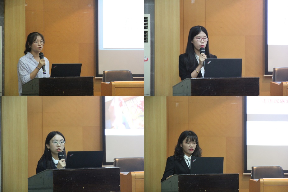 汇报会以一段精彩的视频开始,视频清晰直观地展示了敬文学子2019年暑期社会实践概况及取得的成果。接着,敬文书院2019年暑期社会实践的八组优秀团队代表分享了他们暑期社会实践的成果。青海省红庄沟村“精准扶智”创新探索小分队代表顾植怡同学从少数民族深度贫困地区传统文化对基础教育的影响这一角度切入,讲述了她们团队前往青海省红庄沟村“精准扶智”的经历,广西壮锦及壮族织锦技艺探寻小分队代表熊可仪同学分享了她们团队探寻广西壮族织锦文化的历程,“时间银行”居家互助养老新模式的试点研究实践团队代表黄锦程同学汇报了他们团队调研新型养老模式并且提出模式的建立、推广、改善这一设想的过程,大运河文化传承文明暑期实践团队代表王树炜同学陈述了他们走进民族文脉大运河的经历,追光者实践团代表朱安琪同学将她们团队探究新型社区矫正措施的始末娓娓道来。他们的分享突破时空的界限,利用自身专业知识和丰厚的文化素养在基层领域取得了丰富的成果,体现了敬文学子勇于担当、争做时代新人的责任感。“曼彻斯特大学经济全球化、跨国公司经营管理与金融衍生品课程项目”研修代表胡若涵同学、“美国斯坦福创新与领导力培训营项目”代表孟言同学和“英国剑桥大学暑期学分研修项目”代表曹馨怡同学分别向大家分享了他们在曼彻斯特大学、斯坦福大学和剑桥大学的深造体验。他们的分享充分体现了敬文学子广阔的全球视野和卓越的综合能力。
