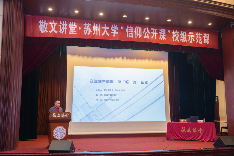 2021年10月13日下午,敬文书院在校本部敬贤堂举行了敬文讲堂·“与全国劳模对话”系列信仰公开课。特邀全国劳动模范、苏州路之遥科技股份有限公司董事长周荣先生主讲题为《在逆境中崛起,做“超一流”企业》的专题讲座。苏州大学团委书记于潜驰、团委副书记徐娜,敬文书院院长钱振明、敬文书院党委副书记、副院长孟玲玲以及全体辅导员,2021年苏州大学“大学生青年马克思主义者培养工程”领军人才计划学员、“惠寒”第二十四届研支团成员,敬文书院优秀青年代表、各学生组织骨干、2021级全体新生参加了本次活动。活动由敬文书院院长钱振明主持。