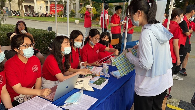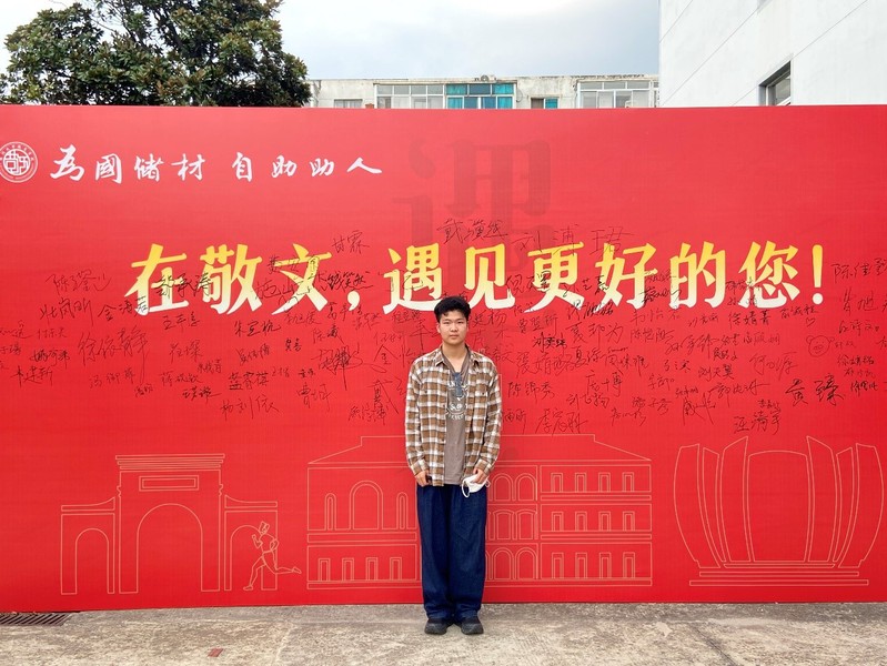 学长学姐们热情高效答疑解惑,帮助扫码报到、发放新生大礼包,引导乘坐校内接驳车,红色的志愿者马甲装点成了靓丽的风景线。报到处正后方的红色背景牌格外显眼,其中“敬文,我来了!”的宣言赫然醒目,“小21”们纷纷签名并合影打卡。