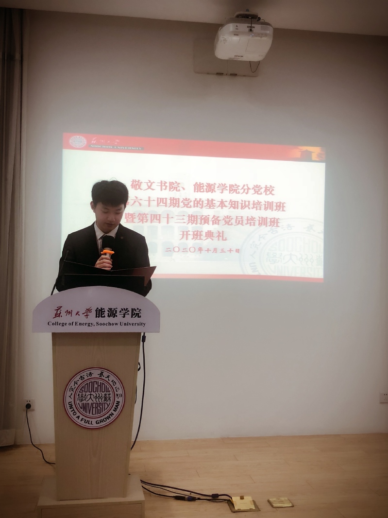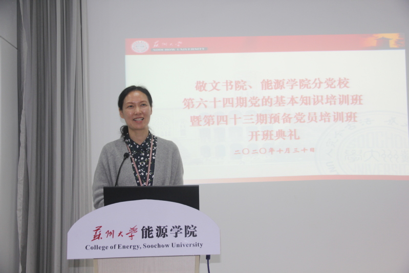 2020年10月30日下午,苏州大学敬文书院、能源学院分党校第六十四期党的基本知识培训班暨第四十三期预备党员培训班开班典礼在新能源大楼115报告厅举行。能源学院党委书记沙丹丹老师,敬文书院党委副书记、副院长孟玲玲老师,敬文书院分党校指导老师孙正嘉老师、能源学院分党校指导老师孙放老师以及敬文书院、能源学院本期分党校培训班学员参加了本次活动。