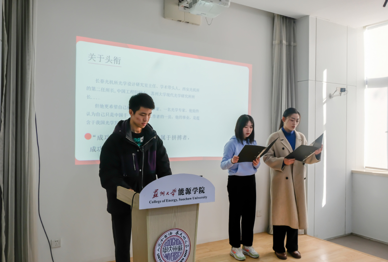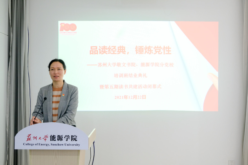 12月22日中午12:30,苏州大学敬文书院、能源学院分党校于能源学院报告厅举行培训班结业典礼暨第五期读书共建活动闭幕式,敬文书院党委副书记、副院长孟玲玲,分党校指导老师周彤,能源学院党委书记沙丹丹、团委书记张振华、分党校指导老师胡碧洋、本科生辅导员魏义凡参加活动。活动由本期分党校培训班学员夏子尧主持。