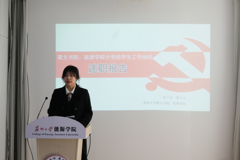 首先,能源学院分党校学生工作组织理事长虞小玉进行述职。她从组织概况、组织架构、工作内容、未来展望、特别鸣谢五个方面讲述了大半年来分党校组织建设的经过与成员教育的成果。同时她对未来做出了展望,也对校党校、两院分党校领导的指导和全体成员的积极参与表达了感谢。