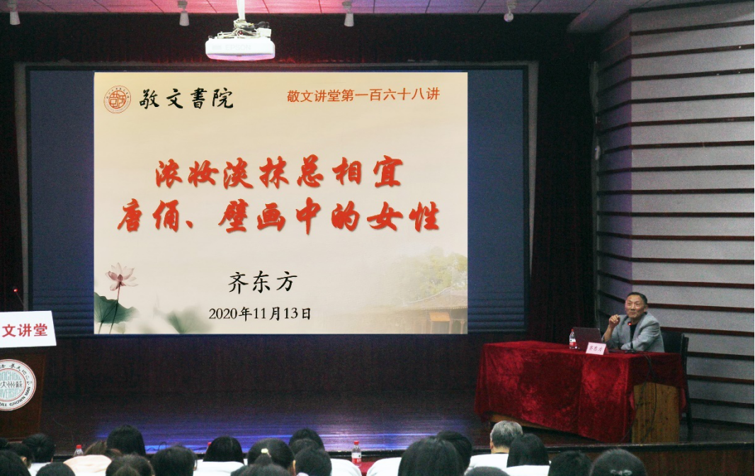 2020年11月13日,北京大学考古文博学院教授、博士生导师,中国考古学会三国至隋唐考古专业委员会主任齐东方应邀做客敬文讲堂,在校本部学术报告厅为同学们带来了《浓妆淡抹总相宜:唐俑、壁画中的女性》专题讲座。本次讲座由敬文书院院长钱振明教授主持。
