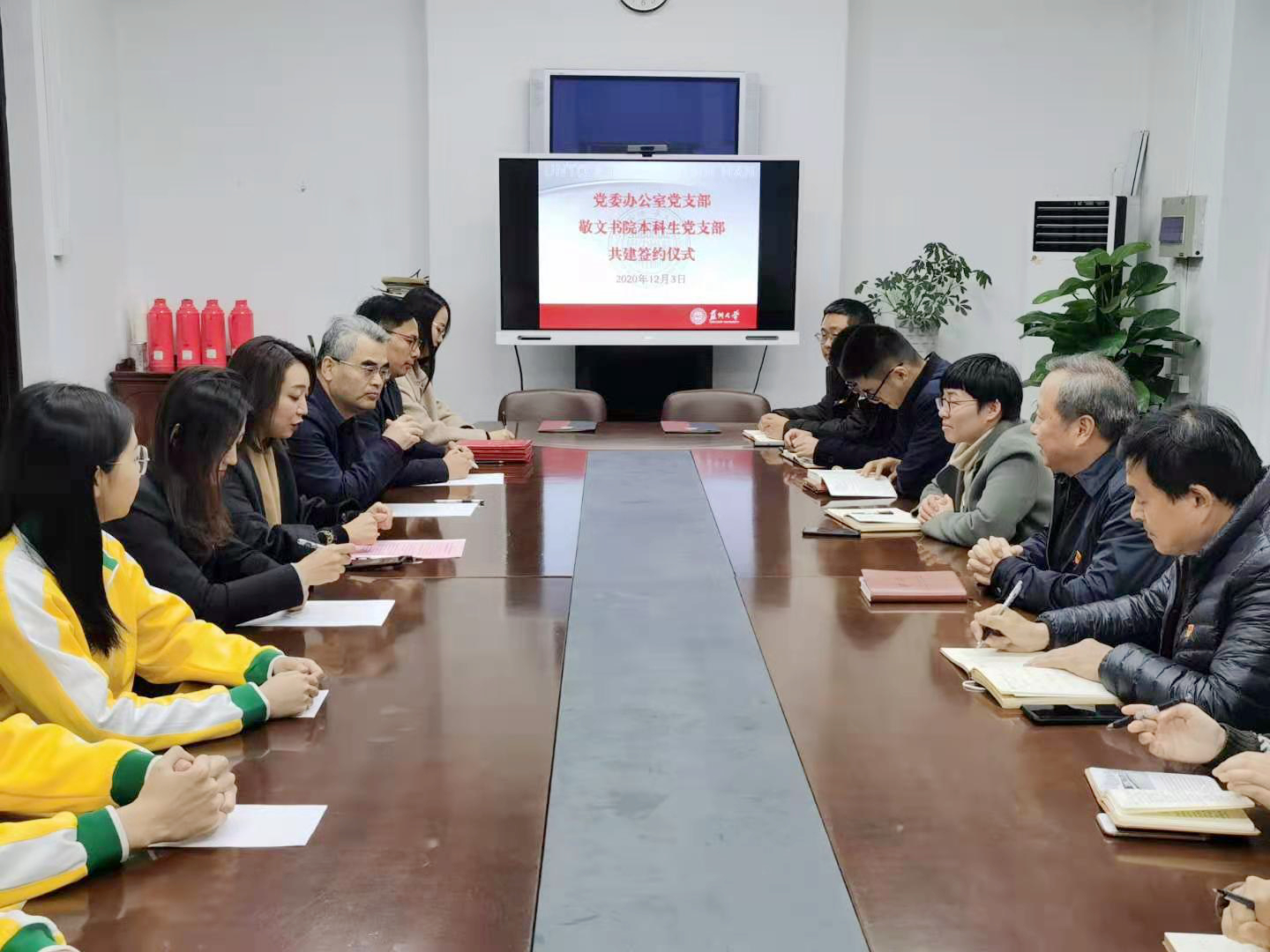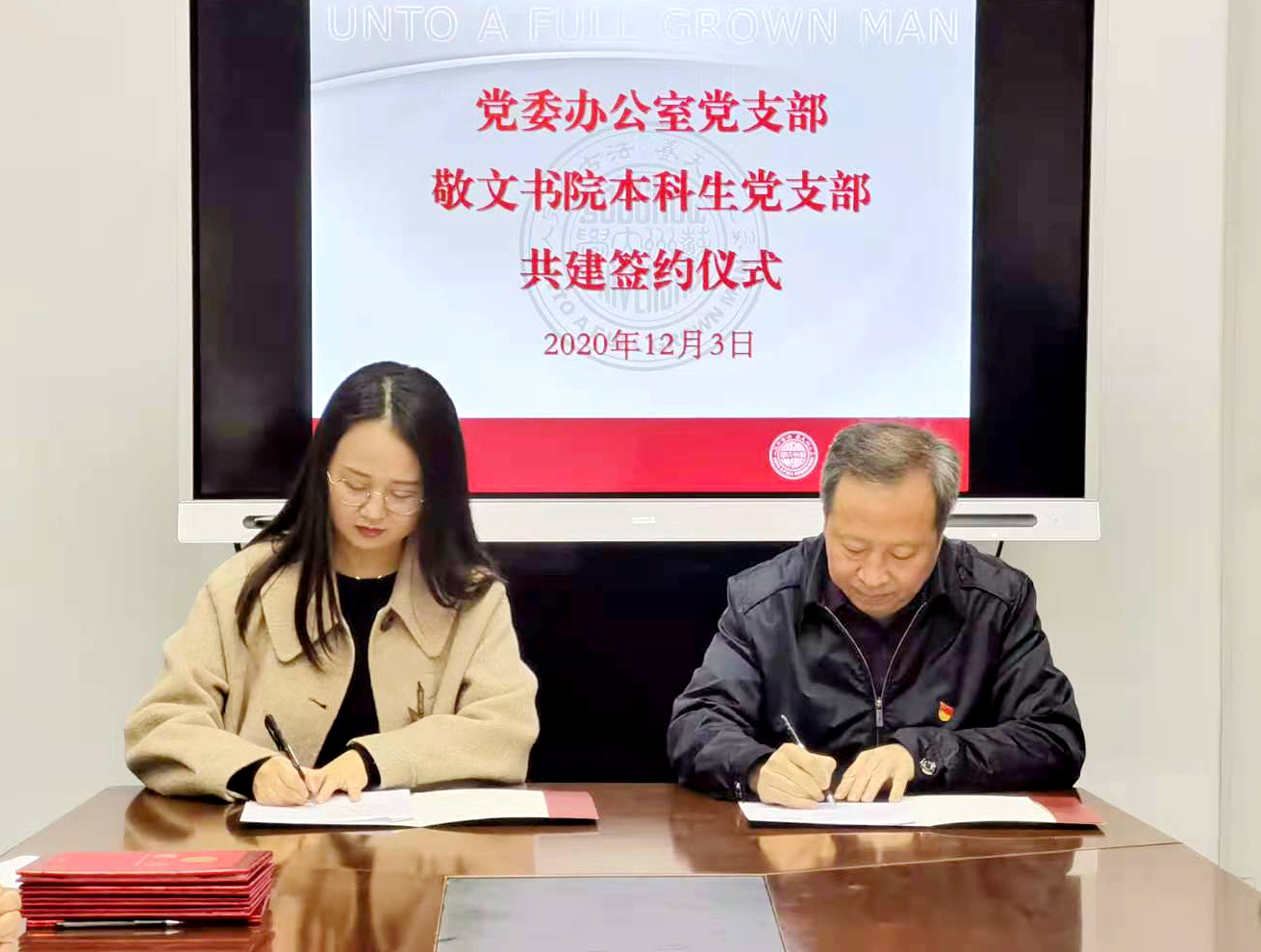 在与会人员的共同见证下,党委办公室党支部书记薛辉与敬文书院本科生党支部书记周彤代表所在支部签署了结对共建协议。