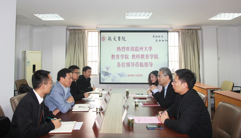2019年11月20日,温州大学教育学院(教师教育学院)党委书记何毅一行4人来访苏州大学敬文书院。敬文书院院长钱振明教授热情接待了来访客人,敬文书院常任导师黄冠平、孙正嘉等陪同交流考察。