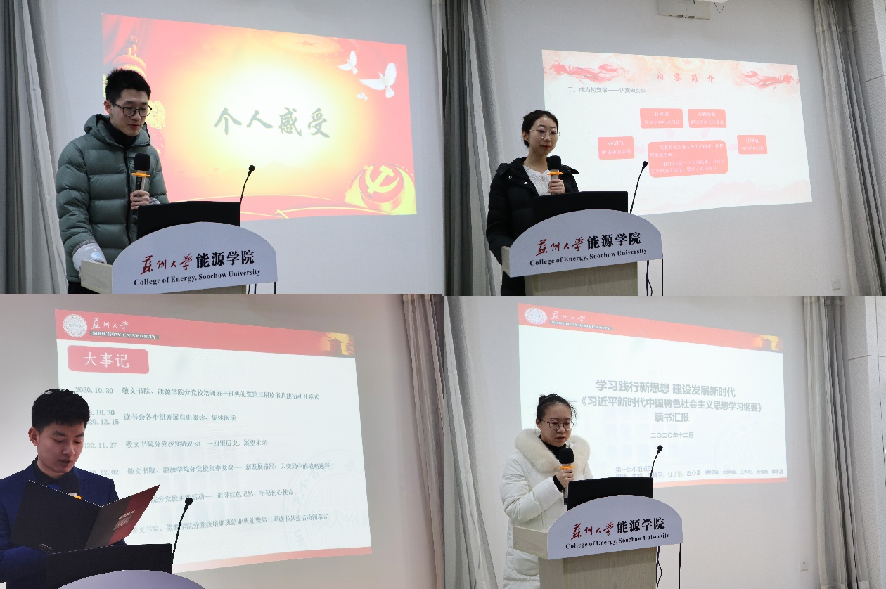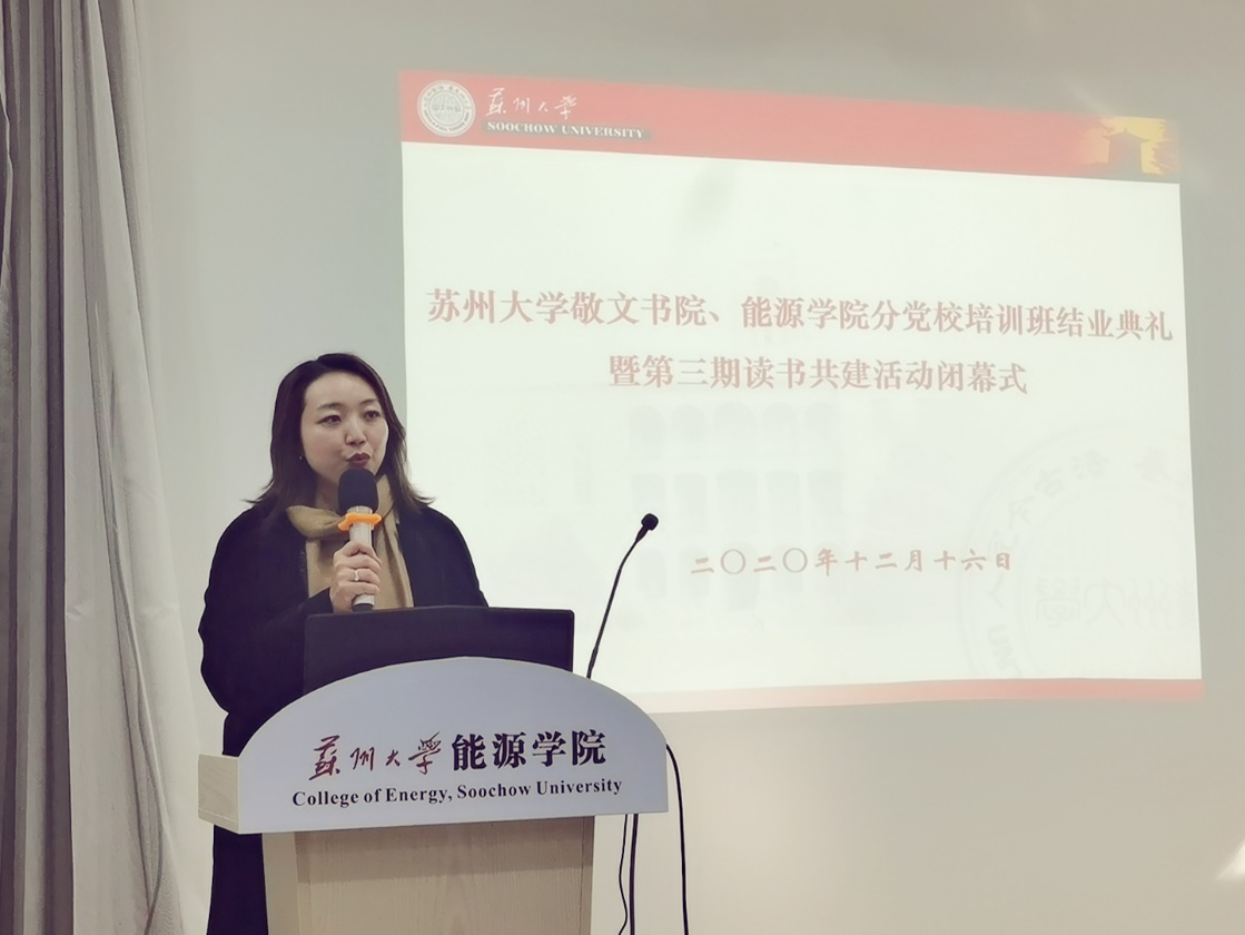 2020年12月16日下午,在苏州大学新能源大楼115报告厅,敬文书院分党校、能源学院分党校联合举行了分党校培训班结业典礼暨第三期读书共建活动闭幕式。苏州大学能源学院党委书记沙丹丹老师,敬文书院党委副书记、副院长孟玲玲老师,敬文书院分党校指导老师孙正嘉,能源学院分党校指导老师孙放,敬文书院、能源学院本期分党校培训班学员参加了此次活动。