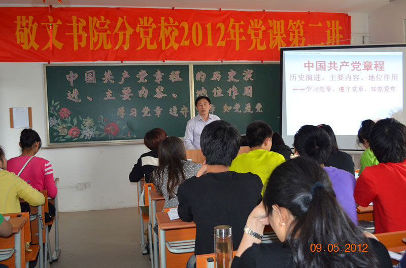 5月9日下午,敬文书院分党校2012年党课第二讲在书院北楼302举行。苏州大学马克思主义学院田芝健教授应邀为书院同学作了主题为“学习党章,遵守党章,知党爱党”的党课。