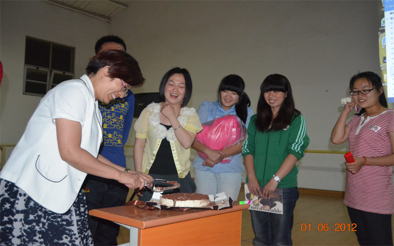 伴随着王亭艺、何娇同学动听的歌声,书院为六月过生日的老师与同学准备了一份特殊的礼物。赵辰、朱墨、张博渊同学与黄河老师一起上台接受了这一份意义非凡的祝福。在王剑敏副院长为大家切蛋糕之后,黄河老师上台表达了自己的感动之情。她表示自己会一直珍藏着这一份礼物,珍藏着大家的情谊,就算无法共同走过四年,也不会忘记这一段美好的日子。