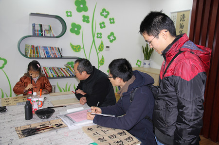 在墨香斋,有部分居民正在翻阅图书。另一张桌子上,一个小姑娘认真地临摹着书帖,边上是负责教她书法的