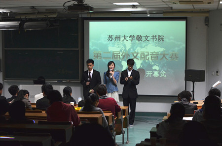 首先登台的“木有”队以自己对人物语言的特色表达,再现了《功夫熊猫》中搞笑的打斗场面。紧接着出场的是“维多利亚”队,他们用观众十分新鲜却陌生的西班牙语成功演绎了《蜡笔小新》中的精彩片段,短片结束后大家还在饶有兴味地揣摩刚刚习得的西语词汇。两组比赛后,2012级的吴铮同学与2011级的“情歌王子”谢易昊同学联袂献上了由《同桌的你》歌词改编而成的《同屋的你》,“谁跟你一起去上晚自习,谁叫醒赖床的你……多年后也许再会面,一起回忆往昔”,反映大学生活真实写照的歌词句句温暖人心,同学们不由地挥起手中的荧光棒,将现场的气氛推向了高潮。之后,“Human cannonball”队用纯正的英语带来了《马达加斯加3》的配音,“Dream high”队将《卑鄙的我》中三个可爱调皮的小女孩演绎得惟妙惟肖。