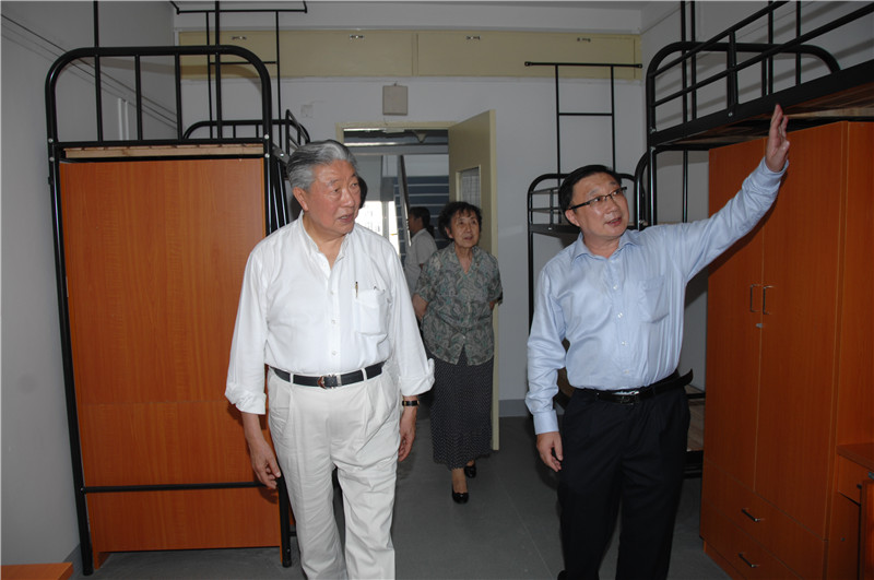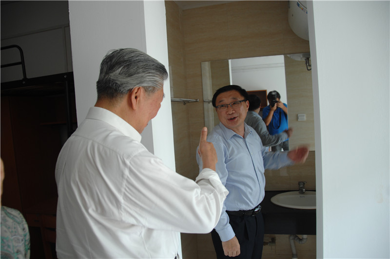 随后,罗院长带着朱恩馀老先生一行人参观了本届2013级学生的新生宿舍。在北苑楼新生宿舍内,罗院长
