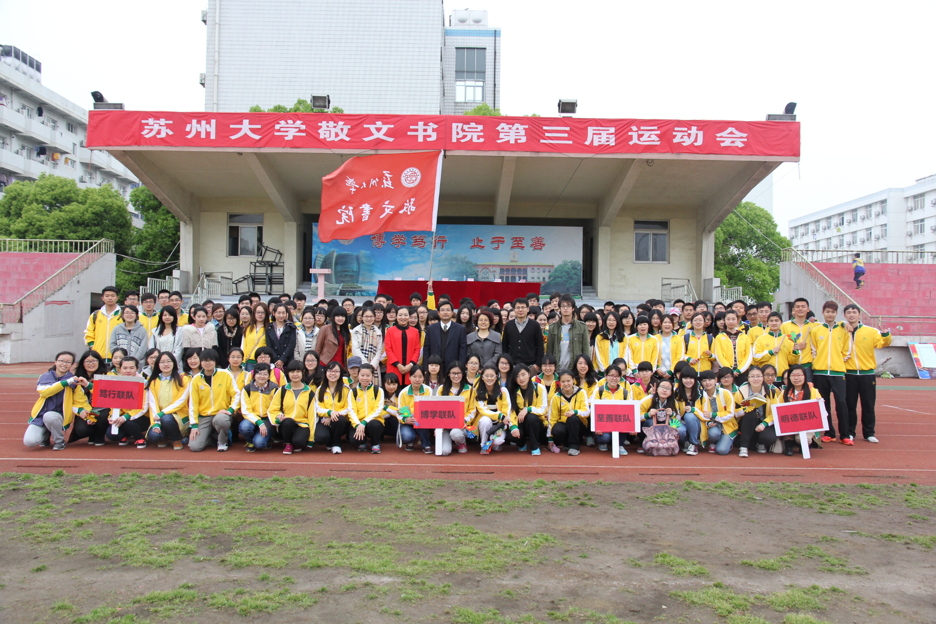 2014年4月13日下午,敬文书院第三届运动会在东校区田径场举行。敬文书院副院长王剑敏老师、学业导师代表江美福教授以及全体常任导师出席了开幕式。王剑敏副院长为运动会致开幕词。她强调本次运动会是书院增强敬文学子的身体素质,弘扬敢于拼搏的体育精神,增强书院凝聚力的重要环节,希望敬文学子能够在田径场上展现他们的飒爽英姿。运动员代表印笑、裁判员代表王琴分别代表此次运动会的运动员、裁判员宣誓。江美福教授宣布本次运动会开幕。