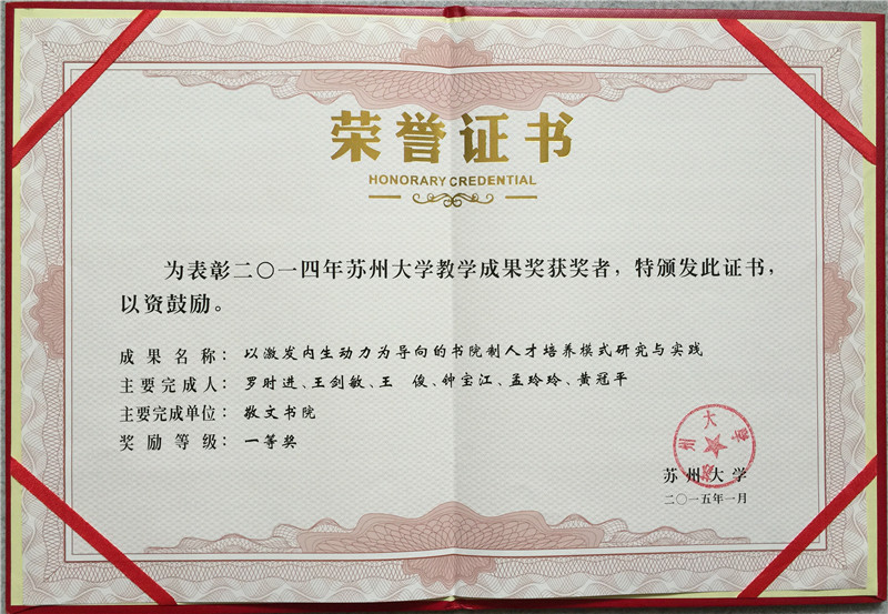 在苏州大学2014年校级教学成果奖的评选中,敬文书院《以激发内生动力为导向的书院制人才培养模式研究与实践》的教学成果从众多参评成果中脱颖而出,荣获一等奖。