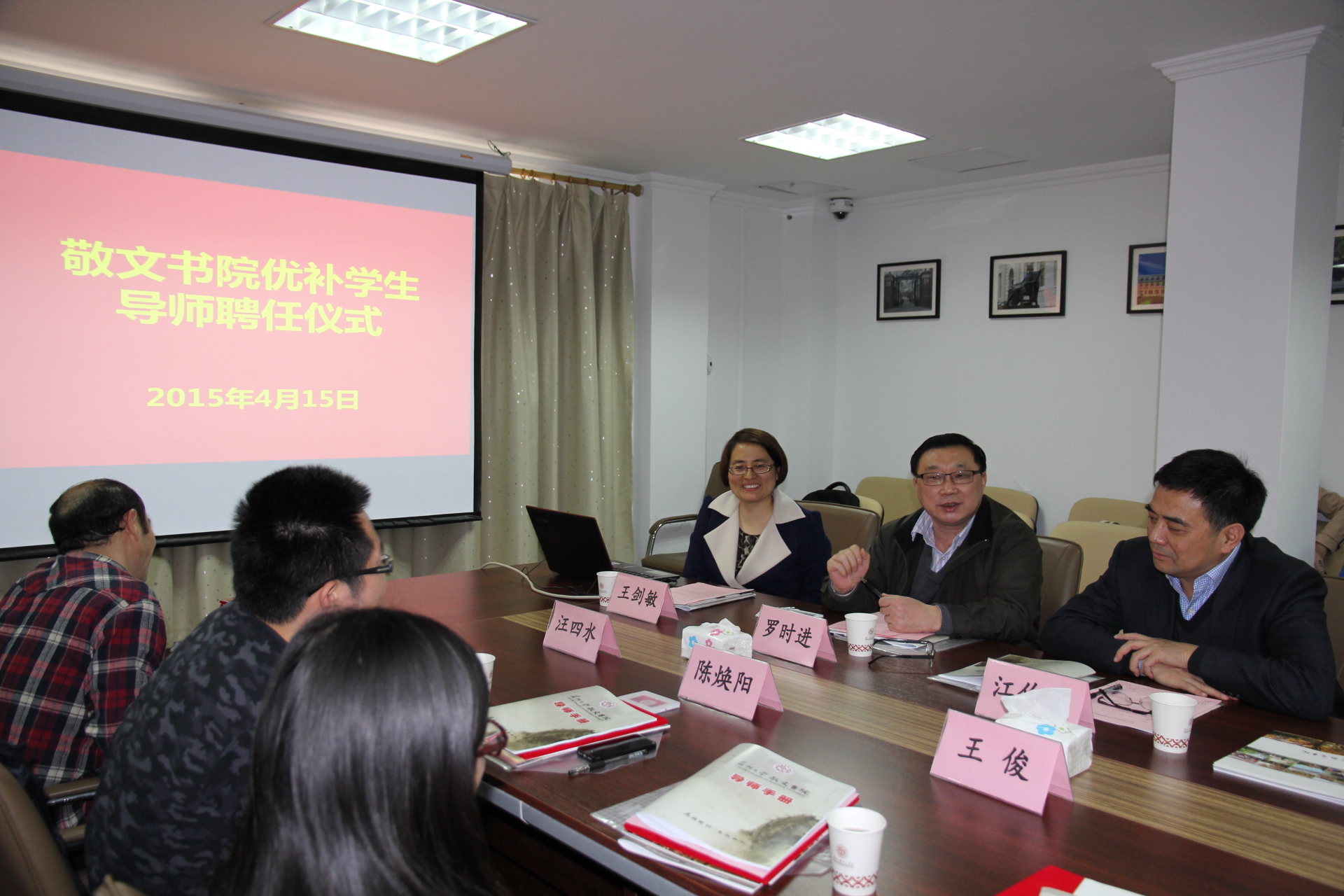 为帮助优补学生更好地适应敬文书院学习生活,更全面地实施导师制,敬文书院于2015年4月15日下午2:00,在校本部书院北苑楼108会议室举行了优补学生导师聘任仪式。校党委副书记、副校长江作军,校学生工作部(处)部长陈晓强,敬文书院院长罗时进,校教务部教学改革与研究处处长、敬文书院党委书记、副院长王剑敏,以及优补学生学业导师出席了本次聘任仪式。会议由罗时进主持。