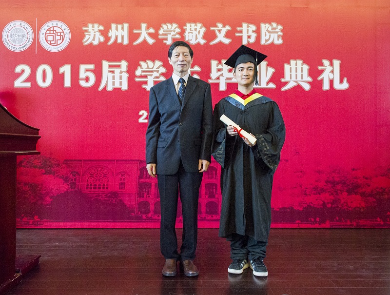 2015年6月13日,苏州大学校长朱秀林教授在敬文书院2015届学生毕业典礼上亲自为每一位毕业生颁发了象征着特殊资历和荣誉的“苏州大学荣誉学生”证书。四年来,敬文书院推出荣誉课程、荣誉项目、荣誉学分等管理机制,学生们须在学业年限内完成书院所规定的学习计划方可从书院顺利毕业,而这一份沉甸甸的“苏州大学荣誉学生”证书不仅是对敬文书院毕业生的鼓励与褒奖,也是敬文学子对学校“自由之精神、卓越之能力、独立之人格、社会之责任”的拔尖创新人培养理念的诠释,更是毕业生们向四年来为他们的茁壮成长倾心助力的母校交出的最好的答卷。四年前,朱校长在敬文书院2011级新生的开学典礼上为书院学生做“如何成为优秀大学生,如何成为优秀的敬文书院学子”的主题演讲,从做人与治学等方面提出具体要求,这是敬文书院学生进入大学后的第一堂课,第一道教育思想之光。四年后的今天,朱校长再次站在钟楼礼堂送别敬文书院2015届毕业生,深情寄语全体同学。朱校长指出,敬文学子各方面取得的成绩具有榜样性的意义,敬文书院提高人才培养质量的改革和尝试取得了瞩目成就。经过四年敬文精神的熏陶,同学们的学习能力、处事能力、社会责任的承受能力都得到了提升。他相信每一位敬文毕业生今后必将在各自的工作岗位上自助助人,为社会发展带来一种正能量。