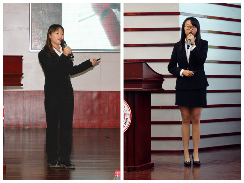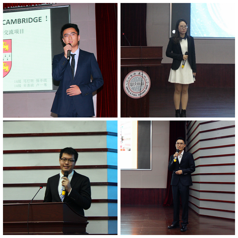 随后,敬文书院各个境内外研修团队的学生代表上台分享了他们的研修历程。首先,2014级会计学专业卢一苇和国际经济与贸易专业保辛琪同学介绍了他们的剑桥之旅,分享了他们的学习感悟以及对领导力、创造力以及教育、文化的新理解。随后,2012级数学专业殷鑫同学分享了他在台湾“清华大学”进行�政研修的经历。接着,在美国各大州立学校如宾夕法尼亚大学、威斯康辛大学麦迪逊分校等校交流的学生代表也进行了精彩的汇报。