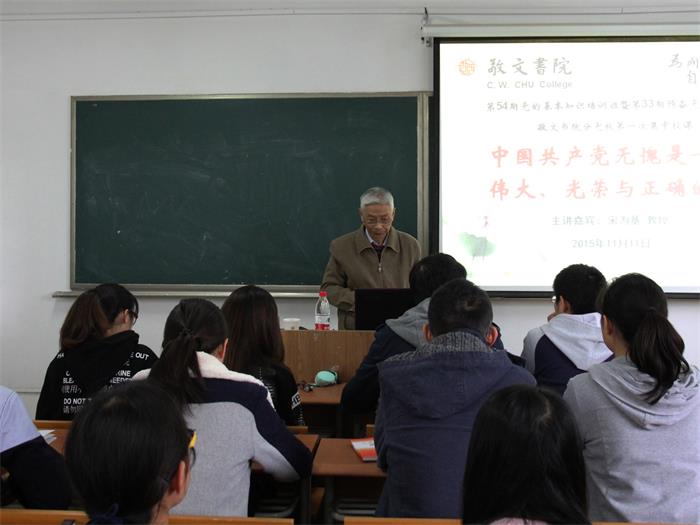 近日,为充分发挥分党校培训在党员培养中的重要作用,积极引导入党积极分子树立远大的共产主义目标,端正入党动机,锤炼党性修养,敬文书院分党校在�苑楼302教室举行了分党校集中授课。本次授课的主讲嘉宾是敬文书院常任导师宋为基教授。宋老师通过生动的讲述,围绕党的历史向同学们深入阐释了“中国共产党是一个伟大、光荣与正确的党”。