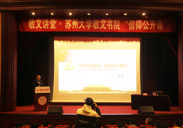 2019年11月27日晚,敬文讲堂第一百五十三讲暨敬文书院“信仰公开课”2019年第二期在校本部敬贤堂举行。教育部青年长江学者、南京大学赵世良讲座教授、南京大学教学委员会副主任、中国马克思主义哲学史学会常务理事暨当代国外马克思主义研究会副会长张亮教授应邀作《<共产党宣言>的历史与理论》专题讲座。敬文书院2018、2019级学生及全体学生党员等300余人参加听讲。讲座由敬文书院院长钱振明教授主持。