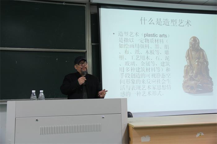 讲座伊始,袁牧教授以现代人对于造型艺术的误解作为引导,向同学们阐释了造型艺术的正确概念并以生动的比喻娓娓道出了造型艺术以静态呈现的特点,从一开始就让在座的同学们对造型美学有了全新的认识。紧接着,袁牧教授从造型艺术的概念进行延伸,将广义上的艺术定义为一种“极致而精彩的人类行为”,通过展示各种艺术形式乃至宗教艺术在人类文明发展过程中如影随形的陪伴,体现出艺术对人类社会进步的重要推动作用,认为艺术开创了人类文明之先河,是人类精神需求的必然产物。随后,袁牧教授又通过几个生活中的常见案例说明在现代社会环境下我们对艺术的精神需求甚至经常会超越对物质的需求。袁牧教授用生动而平易的话语将晦涩难懂的内容阐释得淋漓尽致,让同学们对精神需求与物质需求的关系有了新的理解。最后,袁牧教授从柏拉图等名家对于审美的理解入手,从人的动物性和社会性两个方面告诉同学们什么是“美”,并由此展开,对比东西方传统哲学、宗教、建筑、绘画等美学元素的异同,阐述东西方造型艺术的特点,并从空间的角度将造型艺术分为雕塑艺术、建筑艺术、园林艺术、环境艺术以及书画艺术,特别向同学们展现了中国书法注重线条与结体,行气与意蕴的特点,以及国画对细节以及意象的把握。