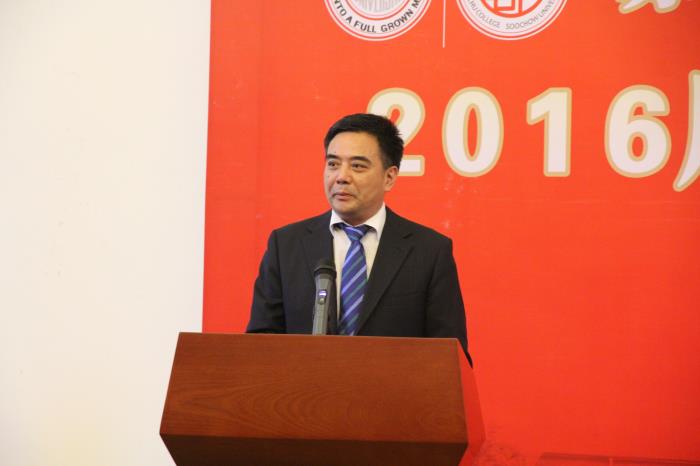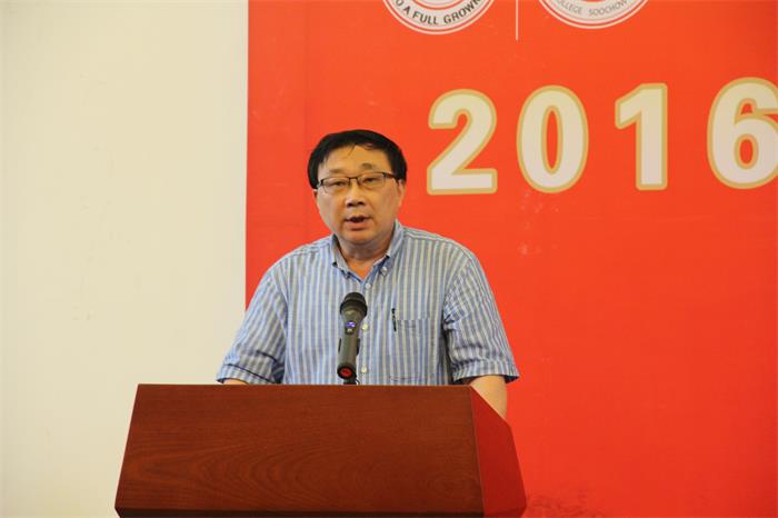 苏州大学党委副书记、副校长江作军教授致辞。他指出,经过了五年的实践,敬文书院这种“新型人才培养模式”逐渐被其他高校所认可并效仿。敬文书院无论是在育人理念、培养目标、导师制实施、社区管理,还是在通识教育与专业教育对接、新型师生关系构建以及研究型国际化人才培养特色等方面都建立了自己的品牌,赋予了“书院文化”全新的内涵。他用三个“有”来评价敬文书院的学生:有修养、有情怀、有追求。希望同学们热爱生活、砥砺品格,脚踏实地、追求卓越,心怀感恩、勇于担当,做一个乐观豁达、积极进取、有责任心、有人文感的“苏大人”和“敬文人”!