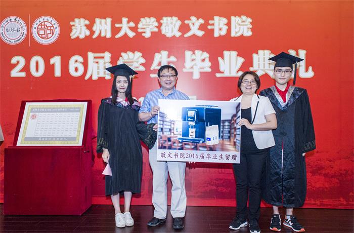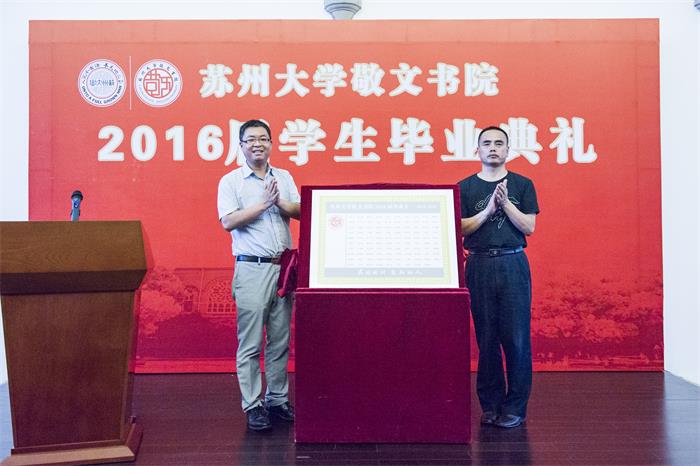 学生工作部(处)陈平处长与校团委书记肖甫青向在场的老师和同学们展示敬文书院2016届毕业生毕业铭牌。全体2016届敬文书院毕业生的名字镌刻在铭牌上,记载了又一个令书院骄傲的学生群体。优秀毕业生王斓、朱雨杰代表全体毕业班同学向书院赠送了纪念品,并寄语学弟学妹传承敬文精神、奋进未来人生。