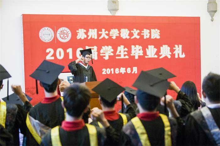 最后,全体毕业班敬文学子起立共同宣誓:“谨遵师长教诲,铭记母校校训,弘扬苏大精神――养天地正气,法古今完人;弘扬敬文精神――为国储材,自助助人。明明德于身心,止至善于家国;行博学于中西,致笃行于善举;牢记母校两院恩惠,勇为社会栋梁,肩负时代使命,报效祖国人民!”坚定而富有感染力的宣誓声响彻礼堂,表达了毕业班学子自立自强、感恩母校、报效祖国的决心。