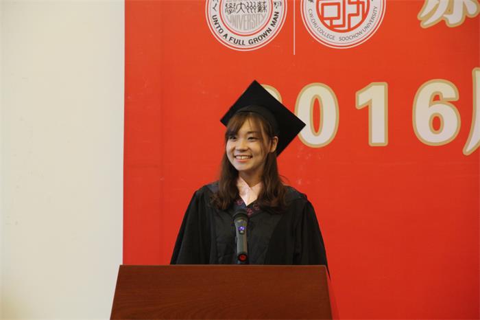 接着,敬文书院2016届毕业生代表王怡萱同学用一个名为“敬文”故事娓娓道出自己与书院四年的情缘。她回首过去,同学们在书院浓郁“家文化”氛围里友爱互助,在科研创新的学术路上拼搏进取,以及在海外研修交流、敬文讲堂等一系列特色荣誉课程中收获丰硕。