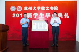 苏州大学学生工作部(处)处长孙庆民与团委书记肖甫青向在场的老师和同学们展示敬文书院2017届毕业生毕业铭牌。全体2017届敬文书院毕业生的名字镌刻在铭牌上,记载了又一个令书院骄傲的学生群体。