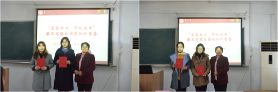 在激烈角逐后,黄冠平老师宣读比赛结果,明德班与至善班以130分打成平手,共同摘得桂冠。王剑敏书记为获奖队伍颁奖并合影留念。