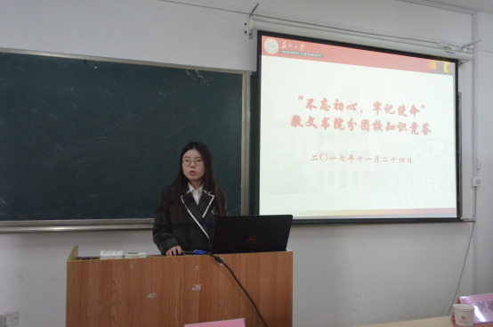 2017年11月24日下午,敬文书院分团校在敬文书院内苑楼302室举办以“不忘初心、牢记使命”为主题的党的十九大知识竞答活动。敬文书院党委书记王剑敏、团委书记黄冠平出席了本次活动。