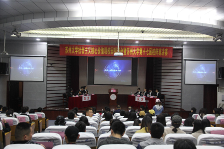 2018年4月14日晚,敬文书院辩论队经过前期一个多月的过关斩将,顺利挺进苏州大学社会主义核心价值观校园明辨会暨苏州大学第十七届辩论赛决赛并最终夺得冠军。