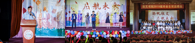 当晚,敬文书院在校本部敬贤堂举办了毕业生欢送晚会,马卫中院长、孟玲玲副书记、学业导师代表、常任导师和全体书院学子出席了晚会活动。晚会开始,马卫中院长首先为毕业晚会致辞。马院长表达了对2018届毕业生的祝福和期待,并深情叮咛敬文书院永远是他们的家,要记得常回来看看。在晚会中,敬文学子们用歌声、舞蹈、视频、相声、朗诵交织着呈现了2018届毕业生与书院的殷殷深情。炫舞大赛的舞蹈点燃了现场,再现敬文学子为集体挥洒汗水的团结与努力。武术与变脸表演《刀剑如梦戏曲变脸》刮起一阵中国风,表演同学的高超技艺让现场掌声迭起。歌曲串烧将浓浓的同学情洒满舞台的每个角落,最后的大合唱更是将晚会带向了高潮,全体毕业生动情高歌,拥抱合影,真挚的同学情谊让人动容。