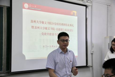2018年6月20日下午,苏州大学敬文书院分党校培训班结业典礼暨苏州大学敬文书院-交通银行姑苏支行党建共建读书会闭幕式在敬文书院内苑楼302教室召开。交通银行姑苏苏大支行行长杨琴,姑苏石路支行行长王琳琳,姑苏支行党支部优秀代表黄儒君,敬文书院党委副书记、副院长孟玲玲老师,敬文书院学生事务中心副主任柯征老师出席了本次会议。会议由敬文书院分党校学生工作组织培训部副部长沈申雨同学主持。