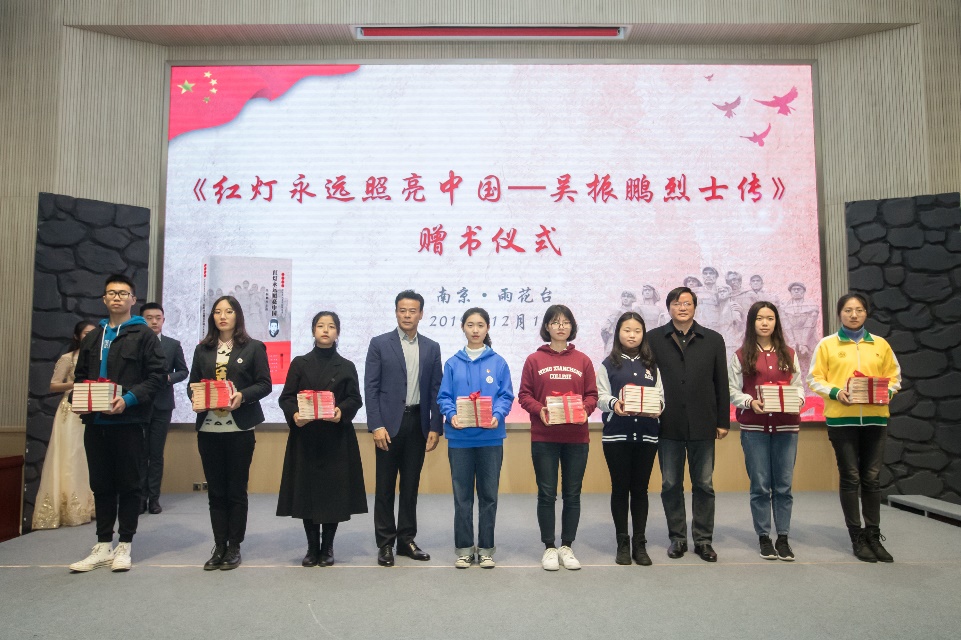 在作家曹峰峻眼里,最为感慨的是这些故事使心灵得到净化,灵魂得以升华。因此,让雨花英烈精神打动人、激励人、鼓舞人,这正是他创作这部纪实传记的宗旨所在、意义所在和力量所在。吴振鹏烈士外孙黄品沅,系全国著名演员、内地资深实力派演员,演过农民、工人、学生,更多的是饰演红色革命题材作品中的士兵、将军。二人随后向联盟学生代表赠书。赠书仪式上他还激情朗诵了外公一篇革命檄文和一封绝笔信。他说道:“今天我们阅读《雨花忠魂》就是为了更好地贯彻习近平总书记关于‘崇尚英雄、缅怀先烈’的系列讲话精神,告慰烈士英灵,期待后来者缅怀先烈、不忘初心、坚守党性!这让我想到我所饰演的角色总让我觉得传递给我的是一种前赴后继的担当和使命,内心涌动着一种伟大时代呼唤伟大的精神的满满正能量!因此,我的内心始终有个愿望,我想自己扮演一次我的外公,让红色的血脉永远传承红色的基因。”