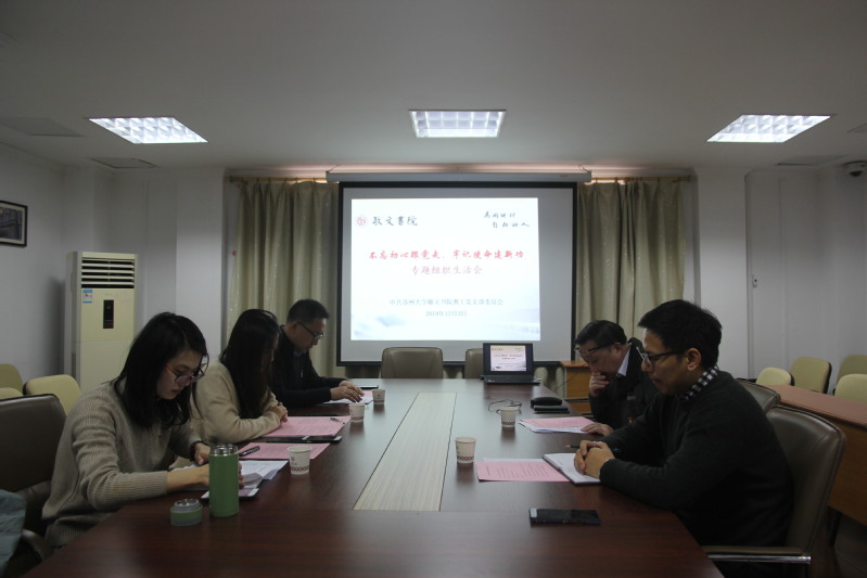 12月3日上午,苏州大学敬文书院教工党支部在敬文书院北苑楼108会议室召开“不忘初心跟党走,牢记使命建新功”专题组织生活会。校主题教育巡回指导组第八组成员魏敏老师、敬文书院教工党支部罗时进教授、黄冠平老师、柯征老师出席了会议。敬文书院党委副书记、教工党支部宣传委员孟玲玲老师因公派出国也通过视频连线的方式参与了此次会议。会议由敬文书院教工党支部书记孙正嘉老师主持。