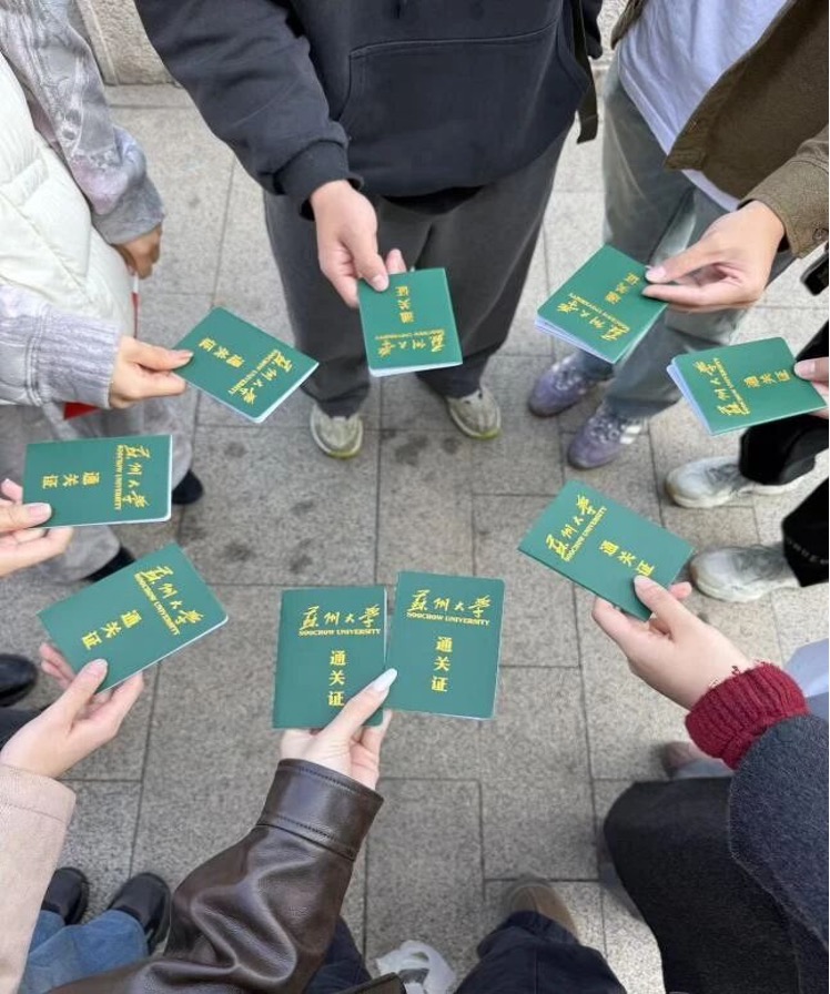 沿途,城墙外的水光映入眼底,风吹动着河面上细碎的波纹;脚下影子被夕阳拉得很长,同学们一边行走,一边感受古城千百年来的呼吸节奏。有人轻声交流学业生活,也有人安静欣赏秋叶飘落的轨迹;有人为队友加油鼓劲,也有人为美景驻足拍照。整段路程在轻快愉悦的氛围中推进,而古城独有的静谧气息也在无形中治愈着每一位参与者。当同学们陆续抵达终点干将桥时,映入眼帘的是秋日傍晚温柔的金色光线,以及属于每一位完成挑战者的专属奖品。此次活动特别准备了定制冰箱贴、钥匙扣与徽章,精巧而富有纪念意义,每件小礼品都像是一路汗水与坚持的回响,更是这段美好体验的温度延续。