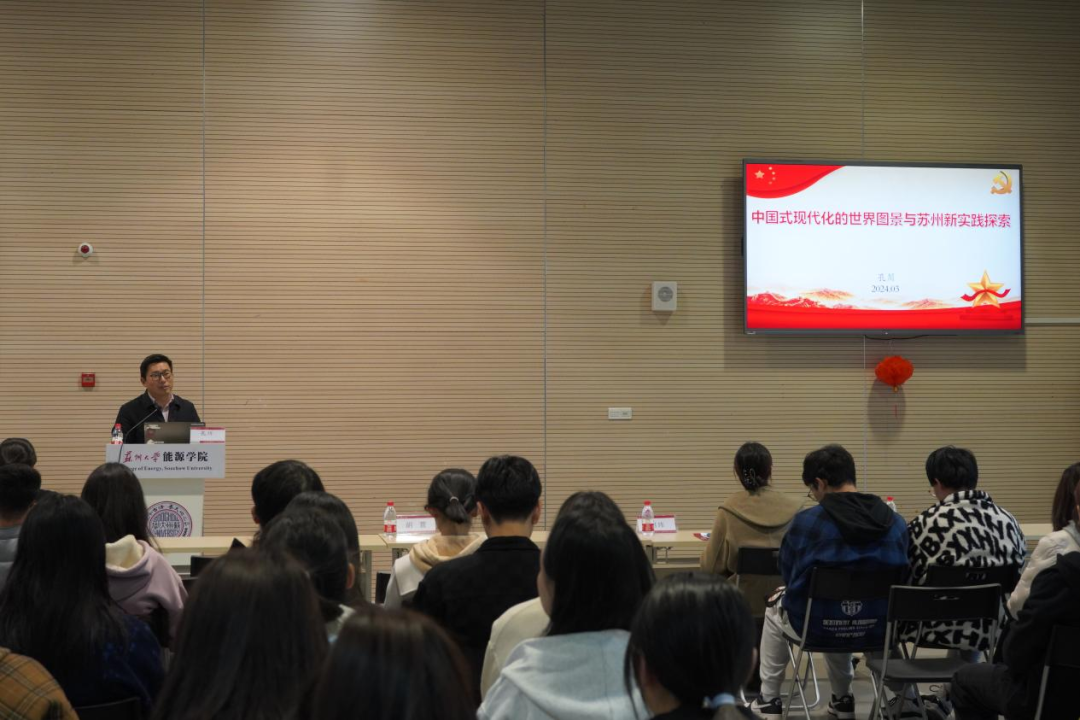 同日,敬文书院、能源学院分党校举行第一次集中授课,本期培训班全体学员共同参加。苏州大学马克思主义学院院长助理孔川副教授主讲《中国式现代化的世界图景与苏州新实践探索》主题党课。孔川老师从党的中心任务谈起,结合国情、历史、国际关系,详细分析了中国式现代化的发展过程、发展目标、发展状态。正如习近平总书记所言,“我们要后来居上,把‘失去的二百年’找回来”。孔川老师对比了中外现代化发展道路,描绘了中国所实现的“历史超越”,并结合苏州发展的具体情况剖析了规划、科技、文化的力量,多方融合强力推进苏州新实践。
