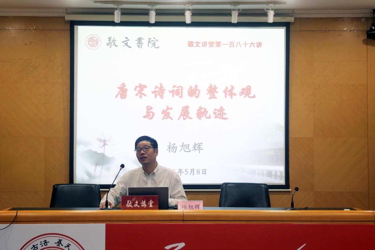 2021年5月8日下午,敬文讲堂第186讲在校本部红楼会议中心115举行,苏州大学文学院教授、博士生导师杨旭辉教授应邀做《唐宋诗词的整体观与发展轨迹》的专题讲座。讲座由敬文书院党委副书记、副院长孟玲玲主持。