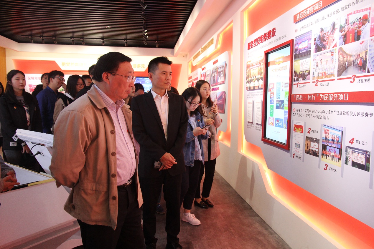 在党建展示馆中,讲解员从党的组织力沿革、党群议事会基层治理、党的网络和微信通关平台建设到党建行业链各方面,向大家展示了党组织的包容与多元。讲解员以张家港红堡基地作为一级阵地为例,向敬文书院分党校学员介绍了党的阵地建设、基层党建难题项目化机制。在这一过程中,罗时进教授与讲解员就张家港出台的“容错免责”、“鼓励激励”和“能上能下”三项机制文件进行了热烈讨论。