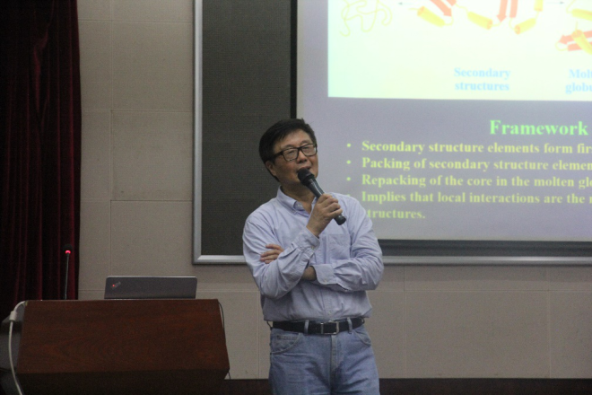 随后,王志新教授向同学们简要介绍了他目前的主要研究内容——蛋白质结构预测问题及相关知识。他表示,该项问题至今仍未被解决,期望在今后的研究中能够有所突破。他向大家展示了蛋白质模型的飘带图以及蛋白质结构示意图,使同学们对蛋白质结构有了深层次认识。在他看来,成为一个优秀的科学家,除了要有较为聪明的头脑,能够发现未知外,还要对科研有所兴趣,常思考一些大问题并在解决问题的路上不断奋斗。发现问题也是自我学习的重要环节,这一点正是区别于课堂灌输式学习、提高学习效率的关键。