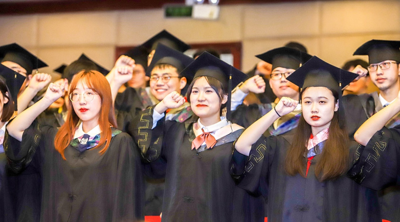 最后,全体毕业生进行毕业宣誓仪式,他们紧握右拳:“谨尊师长教诲,铭记母校校训,弘扬苏大精神——养天地正气,法古今完人;弘扬敬文精神——为国储材,自助助人。明明德于身心,止至善于家国;行博学于中西,致笃行于善举;牢记母校两院恩惠,勇为社会栋梁,肩负时代使命,报效祖国人民!”坚定而富有感染力的宣誓声响彻礼堂,表达了敬文学子自强不息、立德成材、报效祖国的决心。