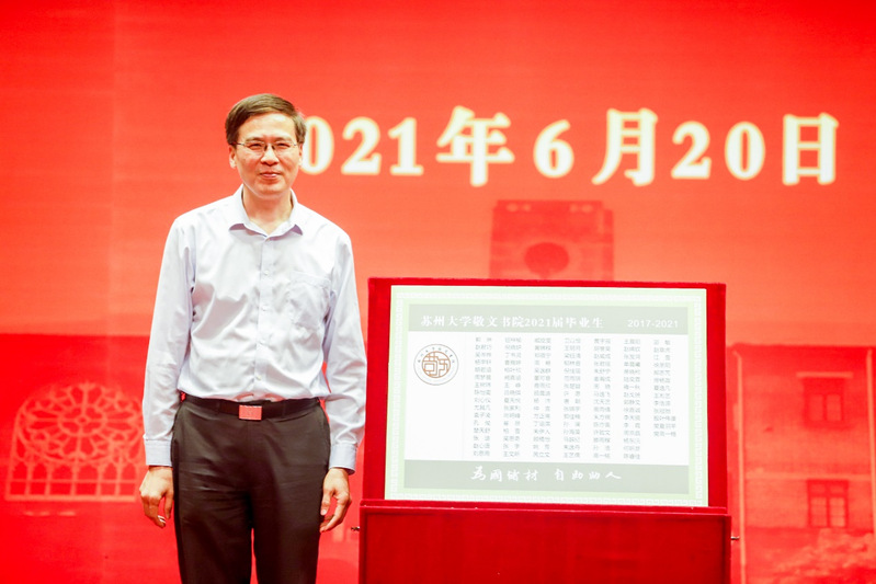 2021年6月20日下午,苏州大学敬文书院2021届学生毕业典礼在校本部敬贤堂举行。苏州大学党委副书记王鲁沛,校党委常委、宣传部部长陈晓强,校团委书记于潜驰,校教务部部长方亮,敬文书院院长钱振明,敬文书院原院长罗时进,以及相关学院(部)分管学生工作负责人、毕业生学业导师代表、毕业班辅导员代表,学生家长代表,敬文书院2021届毕业生出席典礼。典礼由敬文书院党委副书记、副院长孟玲玲主持。