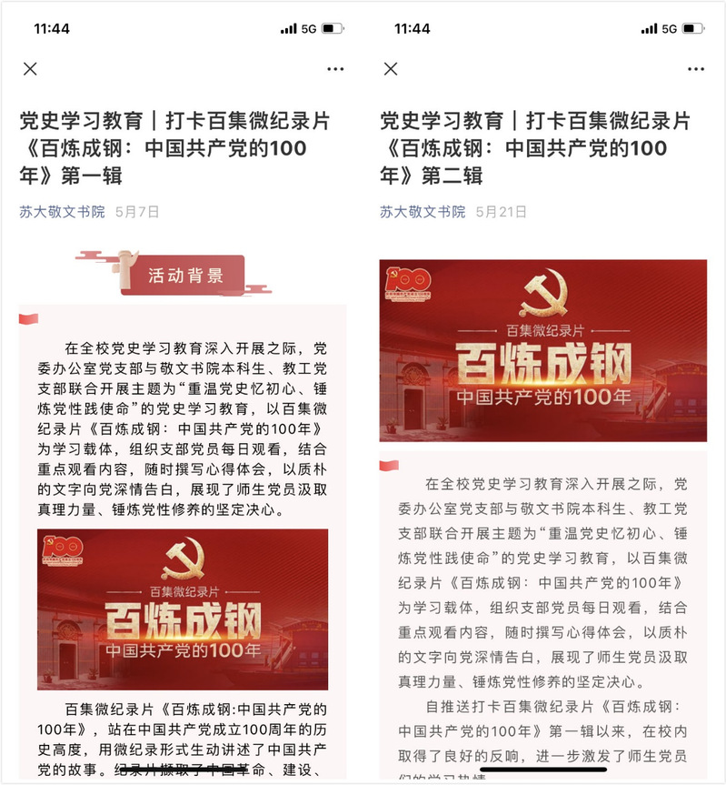 5月,党委办公室党支部与敬文书院本科生、教工党支部联合开展主题为“重温党史忆初心、锤炼党性践使命”的党史学习教育,以百集微纪录片《百炼成钢:中国共产党的100年》为学习载体,组织支部党员每日观看,结合重点观看内容,随时撰写心得体会,以质朴的文字向党深情告白,展现了师生党员汲取真理力量、锤炼党性修养的坚定决心。