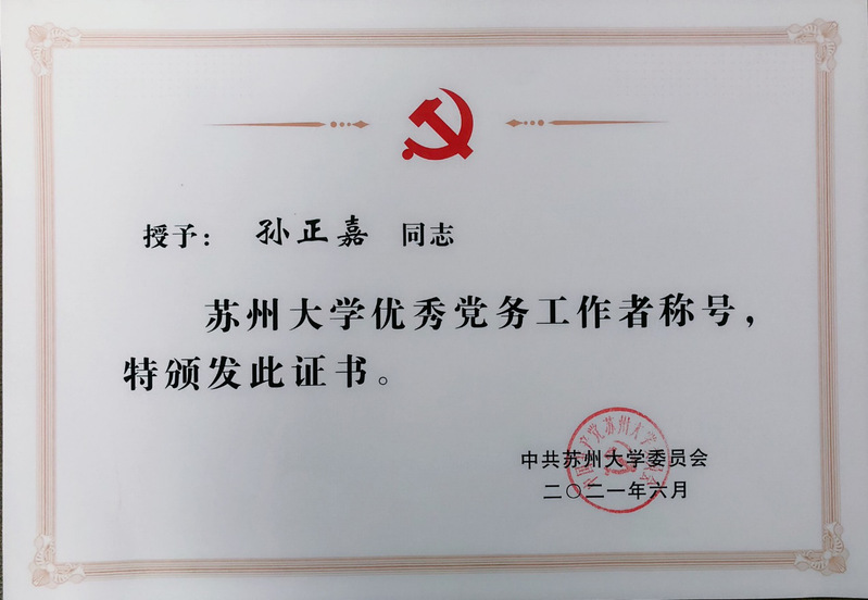 敬文书院党员柯征同志荣获“苏州大学优秀共产党员”称号,敬文书院教工党支部书记孙正嘉同志荣获“苏州大学优秀党务工作者”称号,敬文书院党委荣获“苏州大学先进基层党组织”称号。