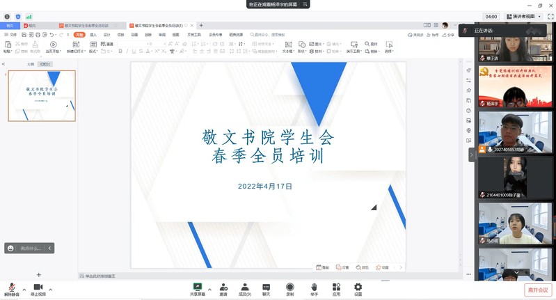 为进一步深化学生会改革,提高学生会工作人员的综合素质,加强学生组织的凝聚力,2022年4月13日晚,我院在腾讯会议召开学生会工作人员全员培训会。会议由敬文书院学生会主席杨泽宇主持。会议紧密结合正在开展的党史学习教育,要求大家要在党史学习中领悟党全心全意为人民眼务的根本宗旨,将学习成果体现在全心全意为同学服务上。