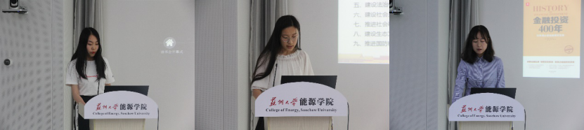 随后,七个读书小组进行精彩的读书成果展示。学员们在《十年激荡,水大鱼大》中体会为理想而奋斗、做时代弄潮儿又勇于担当的精神;在《浴血荣光》中领悟历史选择共产党是必然的,革命之路需要探索,伟大胜利来之不易;在《习近平的七年知青岁月》中感受青年习近平矢志不渝的理想追求、脚踏实地的精神品质和爱国为民的家国情怀;又被《西行漫记》中红军的革命决心和勇于砥砺奋进的精神深深打动。通过阅读《伟大的道路:朱德的生平和时代》,同学们感悟到历史由人民书写,人们要坚持学习并有为国为民的决心。《习近平谈治国理政》则从宏观的角度让同学们了解了中国的国情,激发了读者对中国道路的坚定信念,而《金融投资400年》从金融投资所暴露的丑陋人性为当今中国敲响警钟。