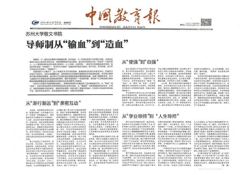 在苏州大学敬文书院的建设道路上,导师制的改革与完善起到了至关重要的作用。从“输血”到“造血”,从渐行渐远的师生关系到亲密互动的书院共同体,从“满堂灌”式的课堂教育到启发式、引导式、实践式的翻转式课堂教学,书院导师制将第一课堂与第二课堂高度融合,打造师生互动教学相长的平台,激发学生自主学习自主管理的内生动力,实现全面发展。